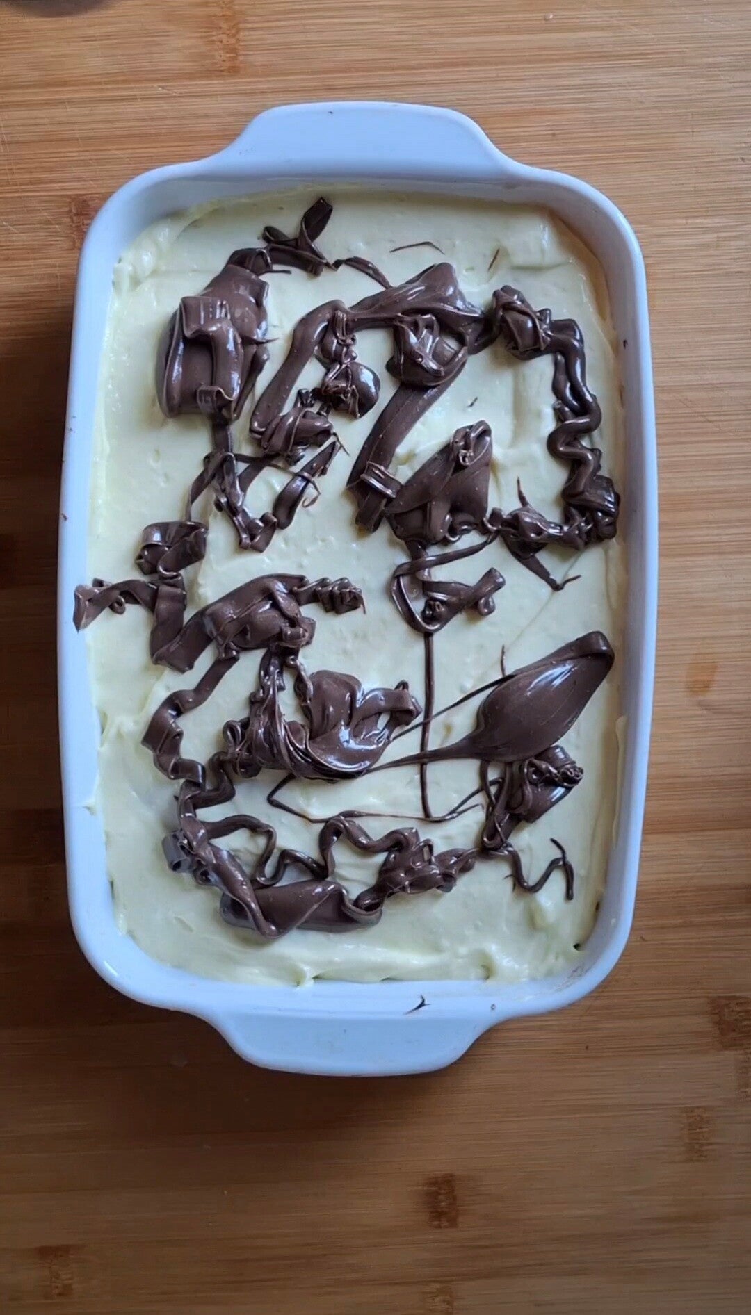 Ora si monta tutto: intingi i biscotti nel caffè e sistemali nella teglia. Copri con uno strato generoso di crema, poi fai cadere qua e là dei cucchiaini di Nutella (puoi scaldarla leggermente per spalmarla meglio).